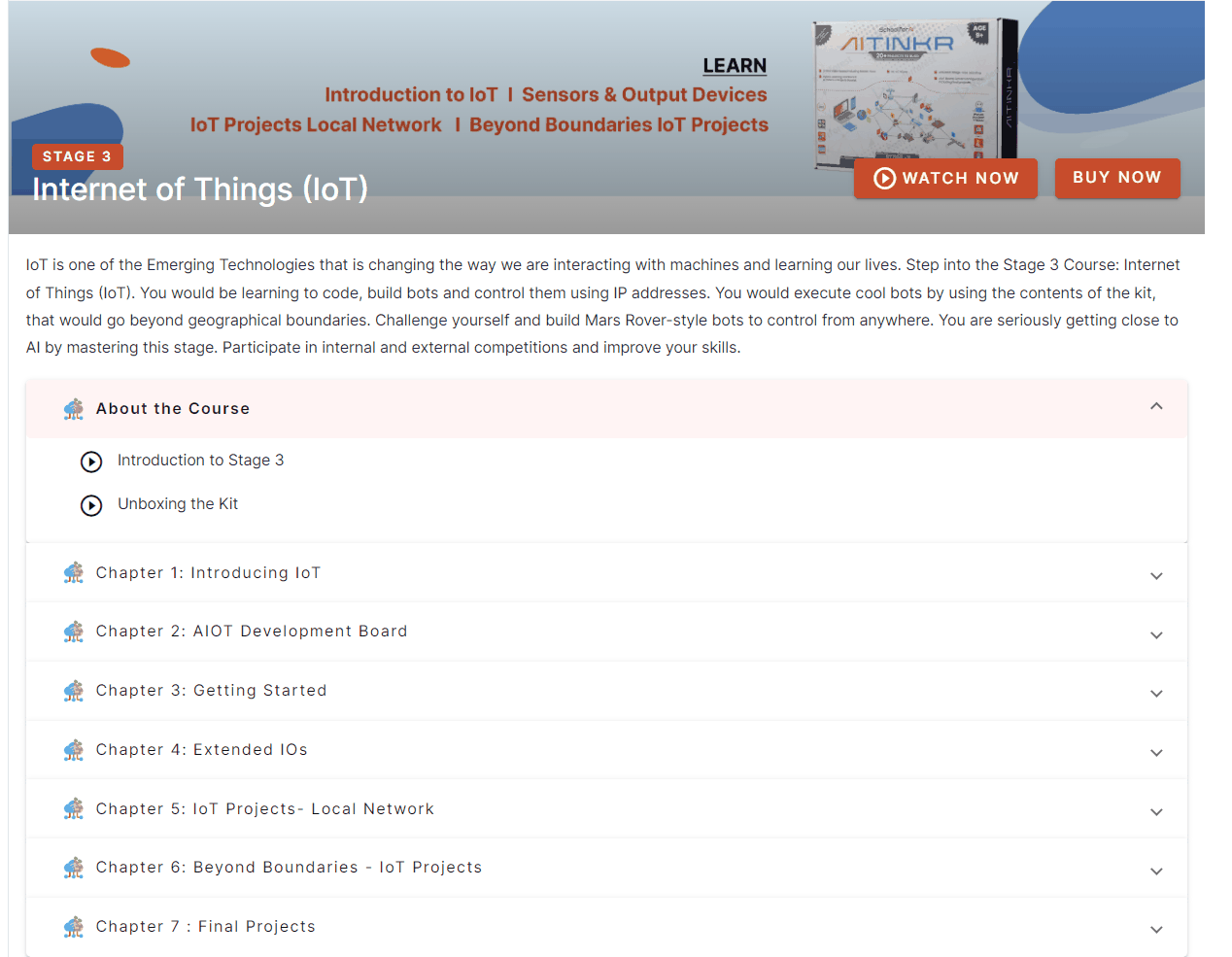 Stage 3 is the Internet of Things (IoT) course, an emerging technology that is transforming the way we interact with the world and control. With the advancement in AI technologies, IoT is coming into the limelight as it could offer continuous data for AI or Machine Learning models. IoT is a combination of hardware and software.