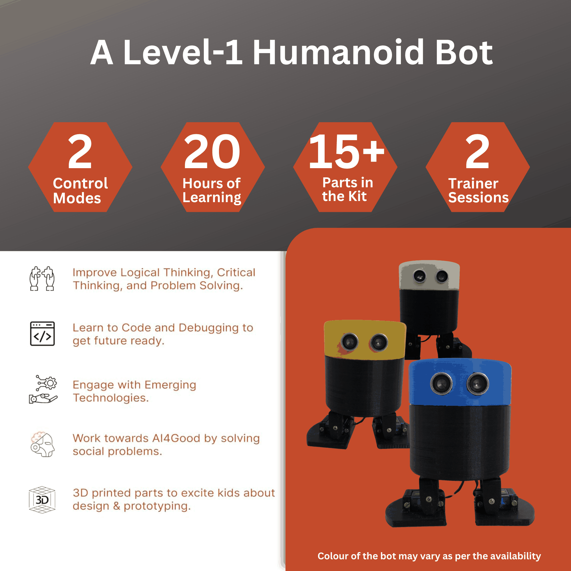 A simple Humanoid bot to introduce human movement in the Robotic form. It serves as a stepping stone towards complex movement to imitate humans. Learn to build using 3D printed parts and code to achieve simple motion. Could also work on the autonomous mode