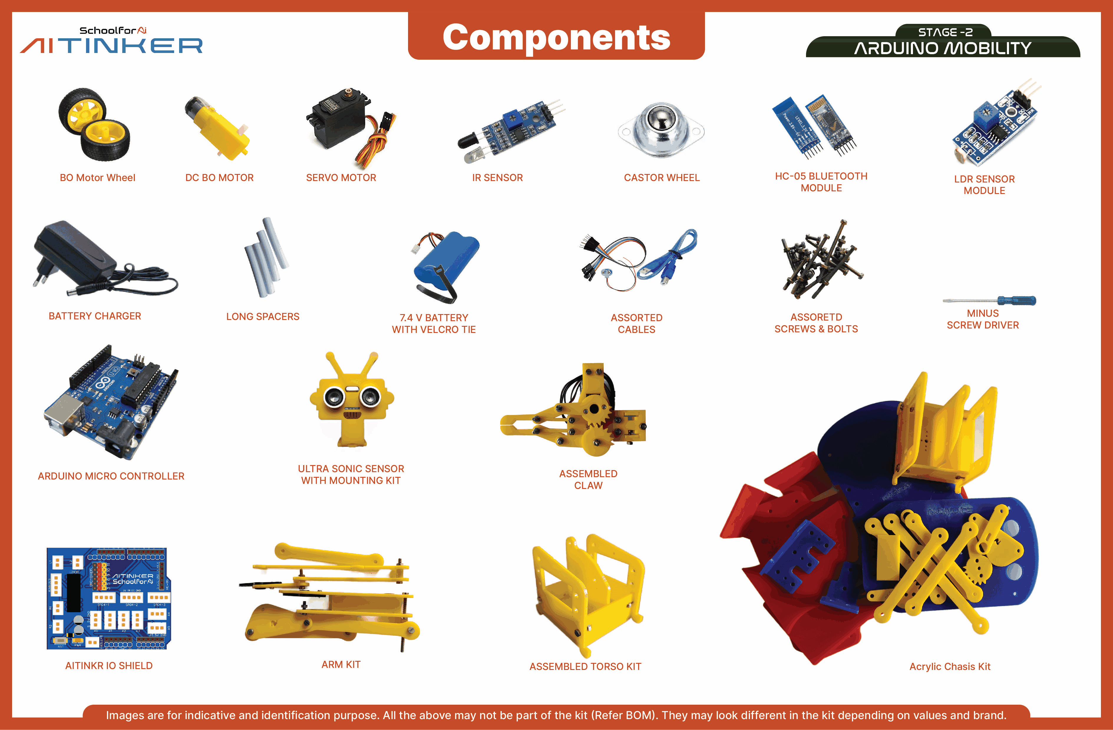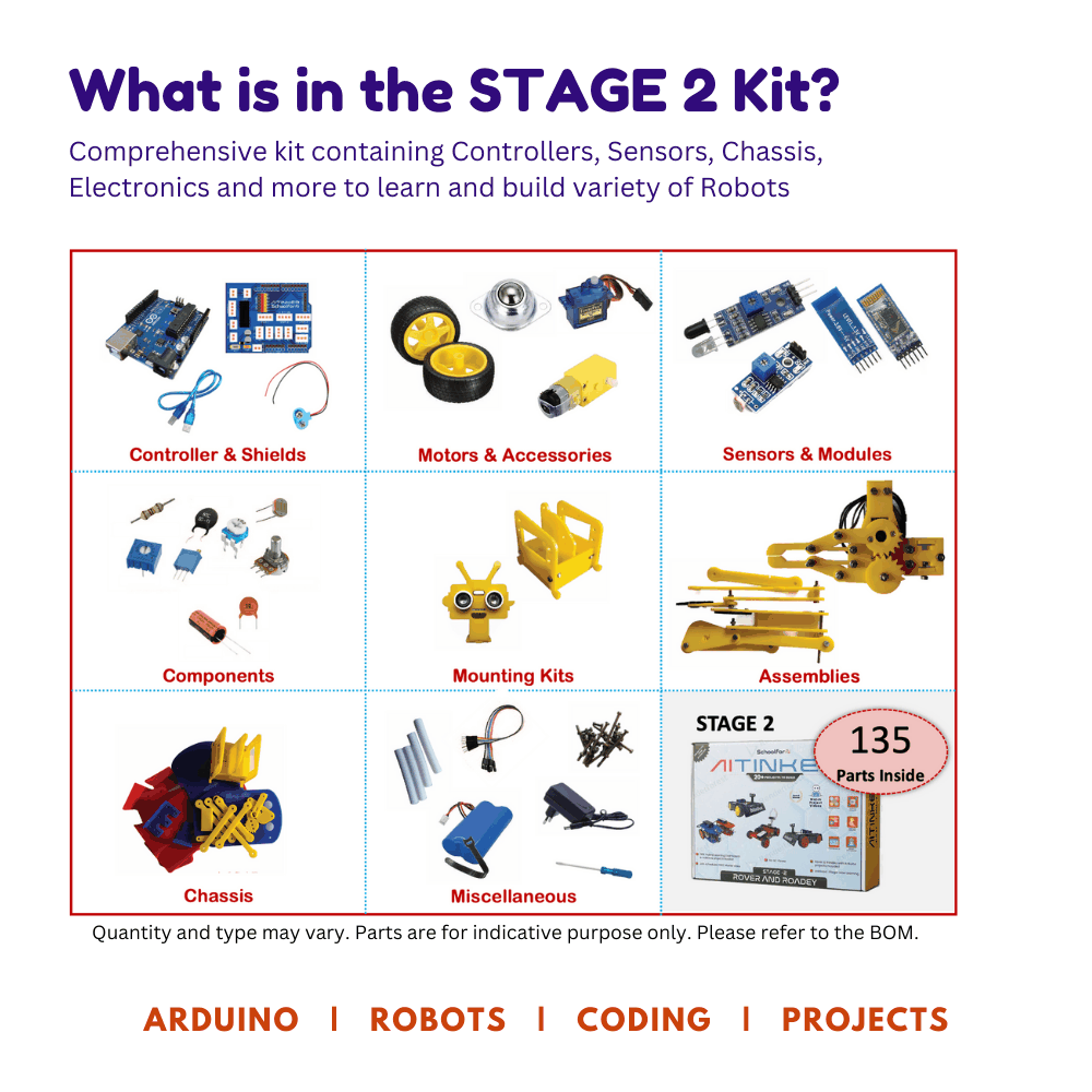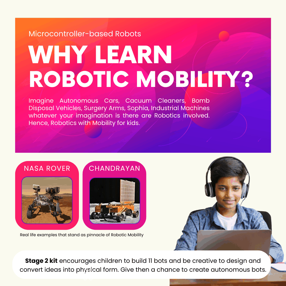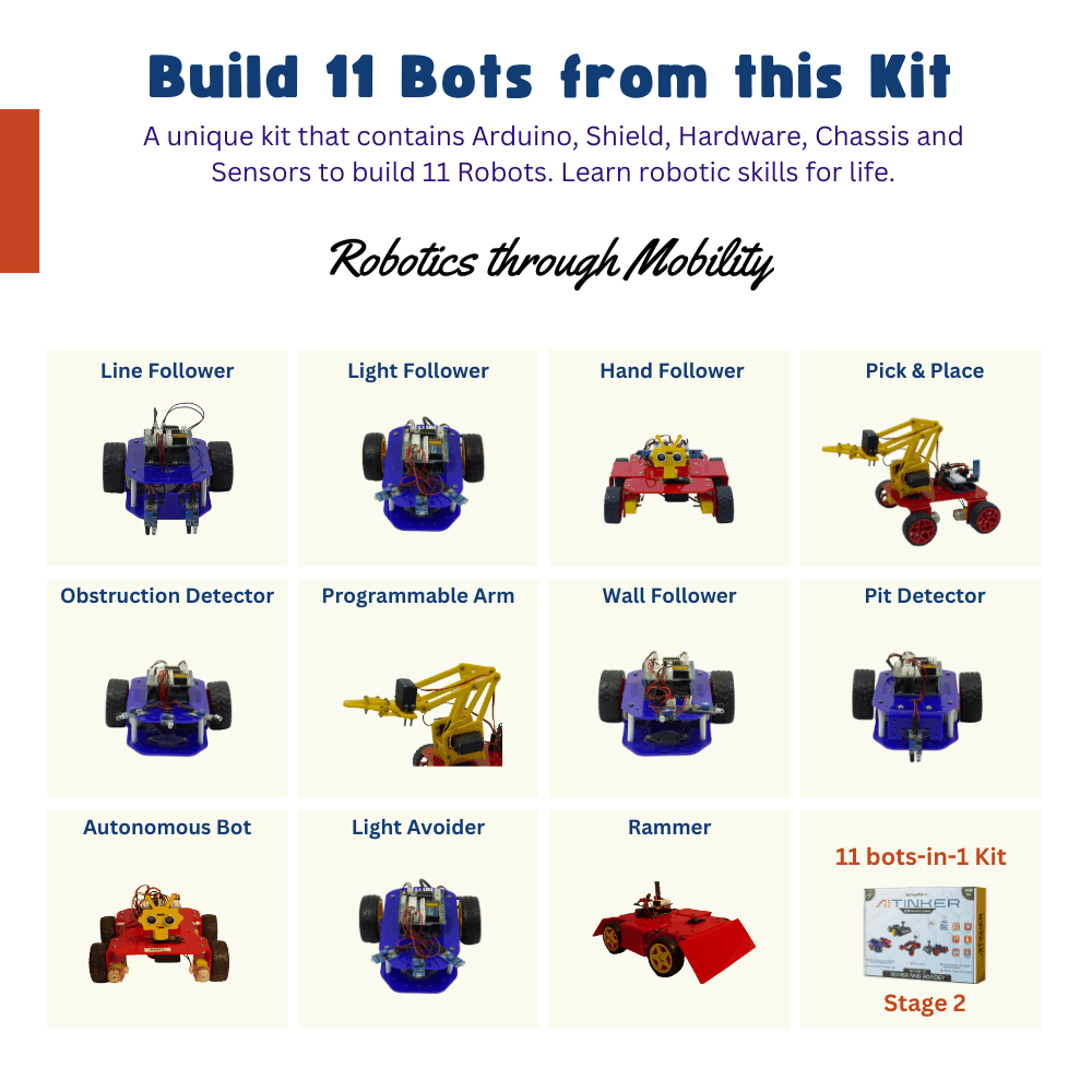 Stage 2 is a Robotics course i.e., Mobility with Robocon Microcontroller. Learners would master the concept of target-specific coding and use the prior knowledge about sensors and shields to build different types of bots. The Challenge would be to think creatively while coding the bots to increase their capabilities and purpose. Learners are given a free hand to explore.